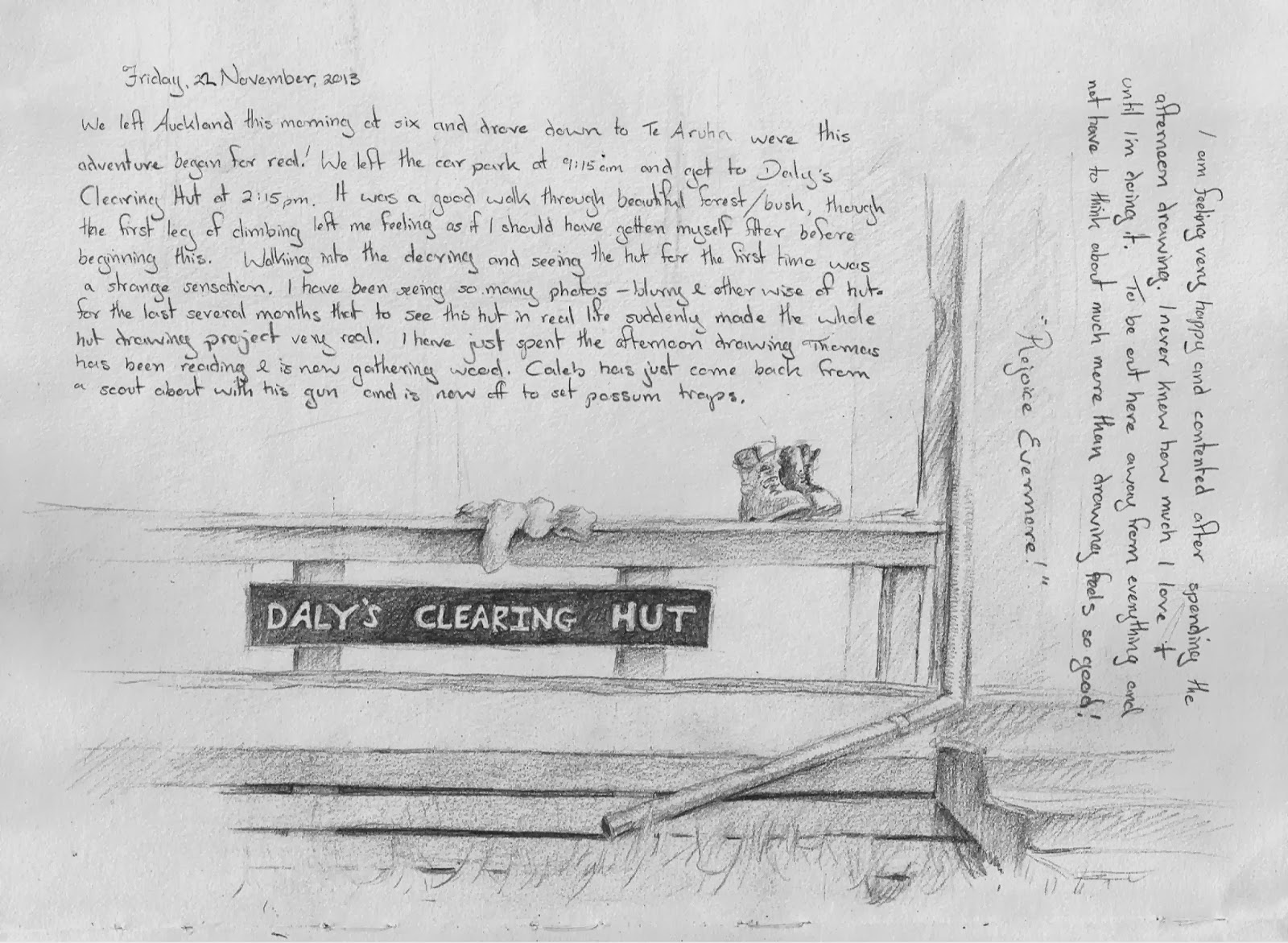 This is a hut which we passed on the way to another hut. I began the drawing on the walk in, but it began to rain so I packed up and we walked on the next hut where we stayed. On the walk out again I stopped to finish the sketch. Thomas ran from there all the way back to the car to begin cooking the rice for lunch. On walking days time was precious because we had to walk all the way out from one hut, drive to the next carpark and walk all the way into the next hut and we never knew exactly how long that would take. On this day we didn't get to the next hut until 11:30 that night. Little did I know that as I sat on the damp grass sketching Skip's Hut.